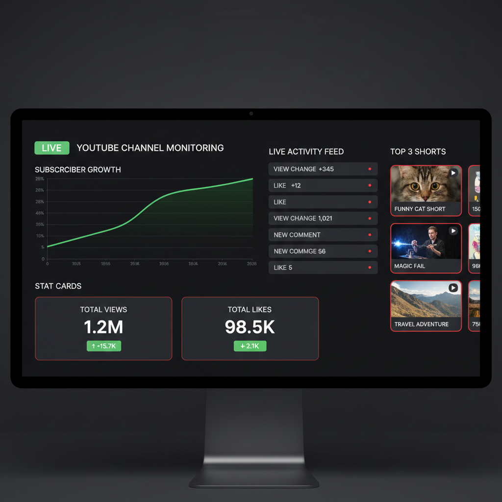 Watch your channel grow in real-time. Subscriber milestones, activity feed, hourly deltas — all live.